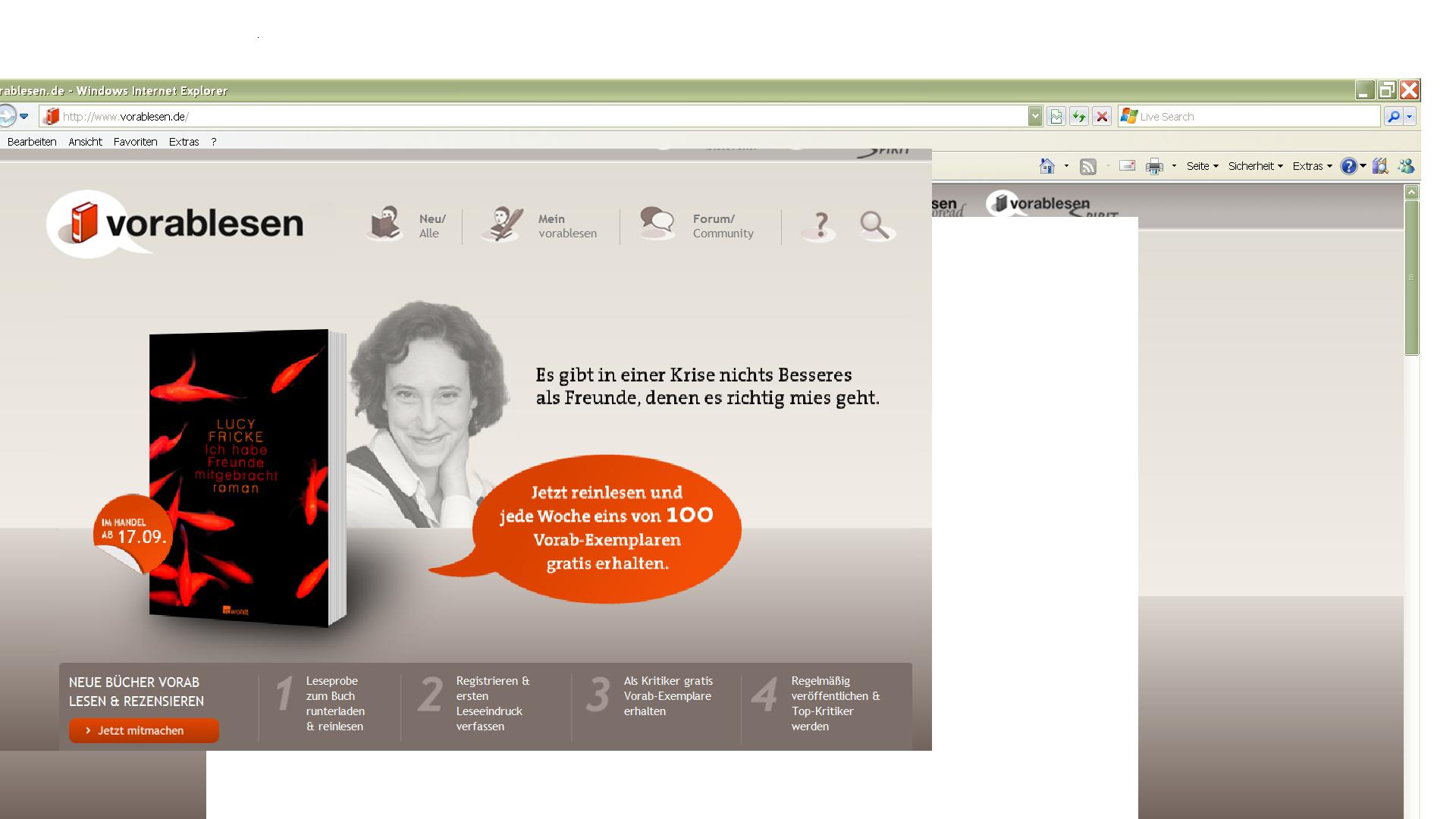 Vom Ullstein Verlag kam der Tipp für vorablesen.de: Hier können sich Blogger Leseproben neu erscheinender Bücher runterladen, eine Meldung zum ersten Leseeindruck verfassen und das Buch dann mit ein bisschen Glück gewinnen. An sich eine grandiose Idee, nimmt doch die Zahl der Hobbyrezensenten stetig zu – das Kontingent der Rezensionsexemplare, das die Verlage zur Verfügung haben, bleibt aber vermutlich gleich (klein). Im Moment befindet sich in der Liste von vorablesen.de noch kein Buch, das mich interessiert, die Gesamtübersicht verrät mir aber, dass da immer mal wieder ein paar Schmankerl dabei sind. Deshalb werde ich die Bücherwurmaugen offen halten und diese neu entdeckte Seite beobachten! Wo mir das Glück ja schon einmal hold war und ich gerade ein Buch gewonnen habe.